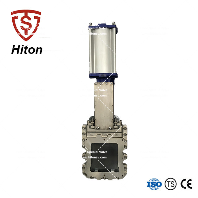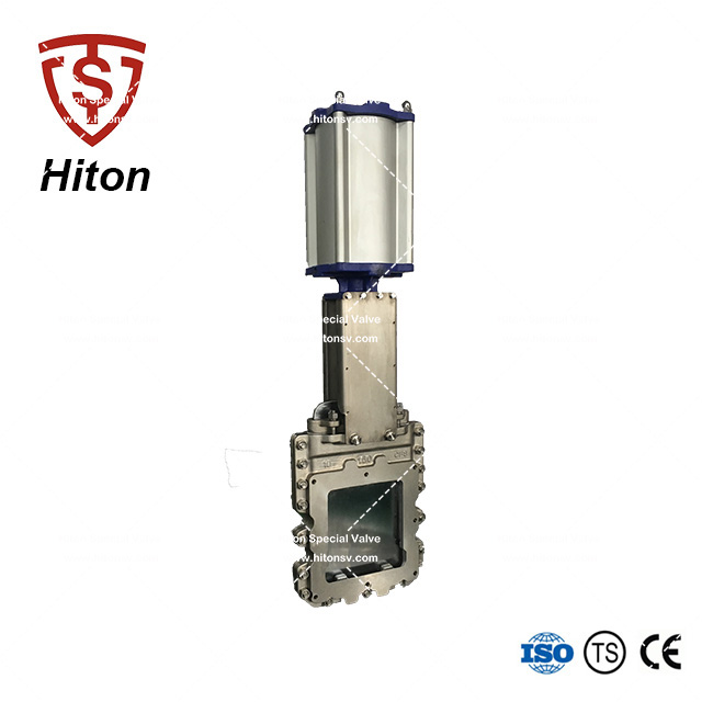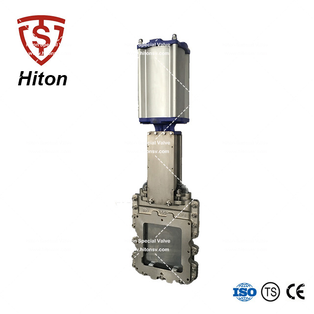 浙江海盾研發(fā)生產(chǎn)的氣動(dòng)方型漿閘閥是一種直行程的開(kāi)關(guān)切斷閥,用于惡劣工況。主要應(yīng)用于回收系統(tǒng),如碎漿機(jī)的垃圾或沙子分離器,高濃度清潔裝置或者筒倉(cāng)排放固體顆粒的出口。此法閥門為兩片式閥體結(jié)構(gòu),圓口為進(jìn)口,方口為出口(比進(jìn)口大),因此介質(zhì)不會(huì)在閥腔內(nèi)積存,非常適合排渣。